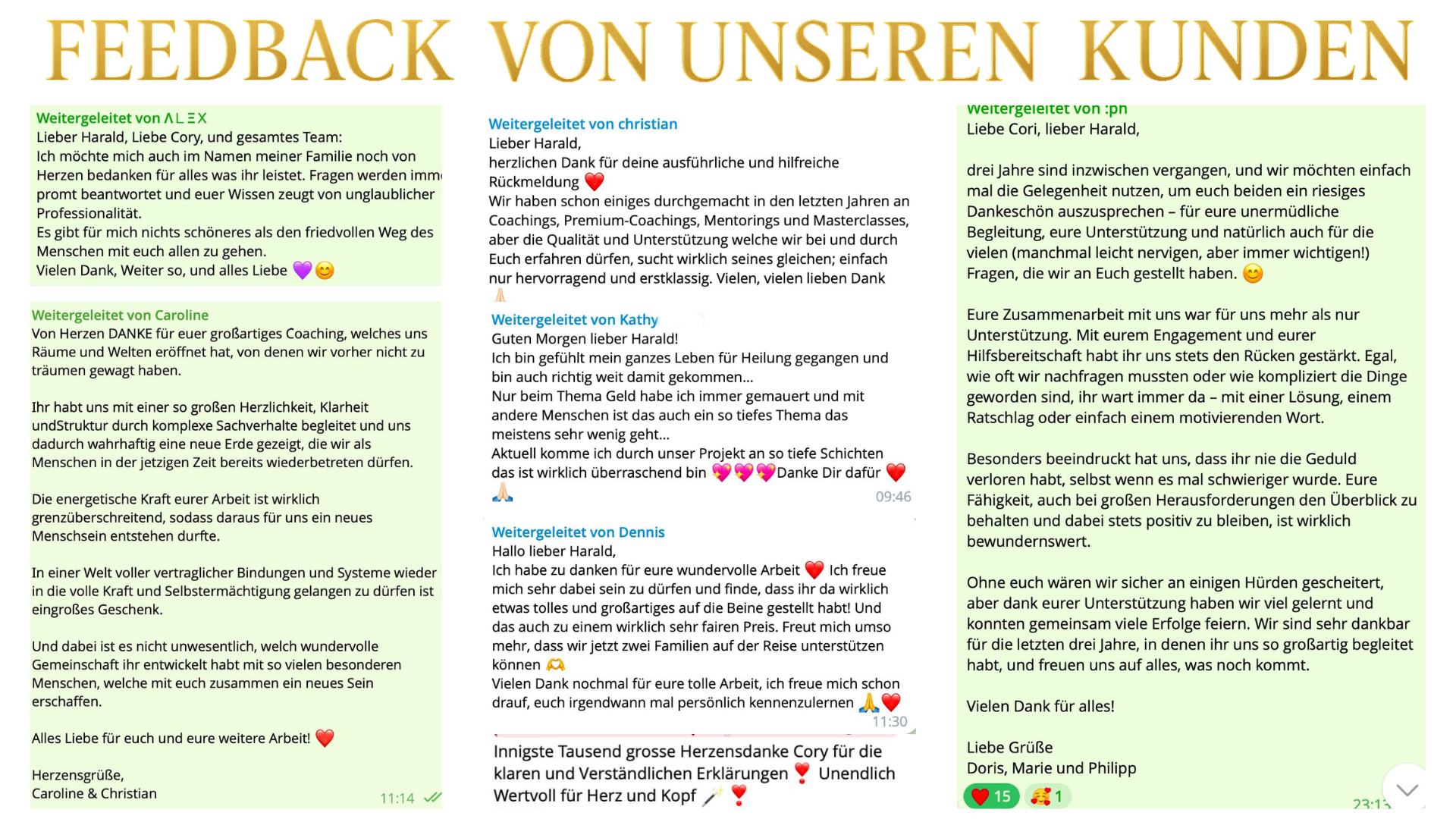 Cory und Harald vereinen spirituelle Klarheit mit strategischer Intelligenz – ein bewährter Weg, der bereits Tausenden Menschen weltweit zu echter Unabhängigkeit verholfen hat.